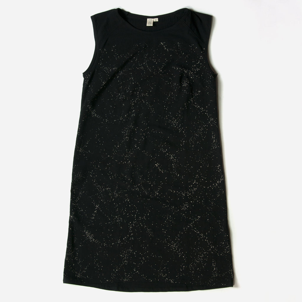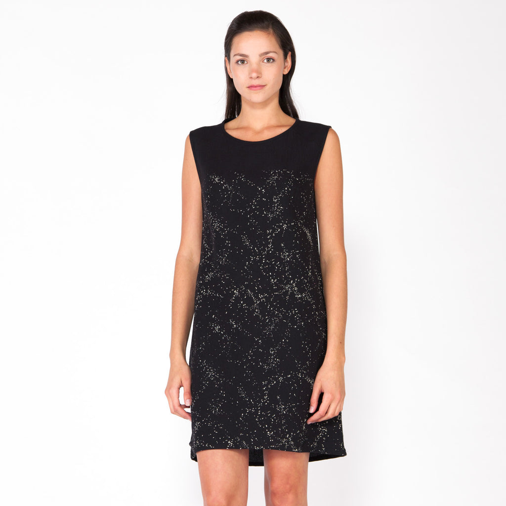 Turn heads with with our subtle shattered pattern printed on a flattering shift silhouette. This dress features a scoop neck and raglan piecing with a straight fit through the body. Falls above the knee. White ink hand printed on black crinkle.